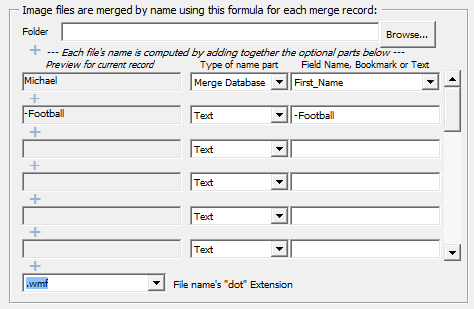 Lower (Breakdown) Section of the Dialog This is where you can enter the formulas that are used to compose file names for every row (record) from the data source. The results of these lines are stuck together end-to-end by OnMerge Images to form a file name for each OnMerge Image. Folder The "topmost" folder name where the image files (or various subfolders containing image files) are located. By default, OnMerge Images assumes images will be in the same folder as the master merge document. You can directly enter a new folder name (be sure to enter the trailing \ character), or press the Browse button to select a folder from a list. Note that the Browse button's list of folders doesn't show the individual image files inside the folders. Use Windows' File Manager to locate the files if you're unsure what folder they're located in. It's a good idea to always use a complete folder name instead of assuming that images will be in the same folder as the master merge document. That's because merging to a new document will often create the new document in another folder. When that happens, the images won't be in the same folder as the new merged document, and the new document won't be able to "reach" the image files. Name Part Each file's name can be composed from several pieces of text. Each piece can be manually entered, or can be "looked up" for each row from the data source. The gray area to the left is a preview of that name part for the current row shown in the upper section of this dialog. You can have up to 20 name parts. Only 6 of them are visible in the dialog at one time; you use the scroll control to the right to access the other 14. To edit any name part, first select the Type of the name part from the drop down list, then enter a value as shown. The changes that you make will be shown immediately in the Preview section above.