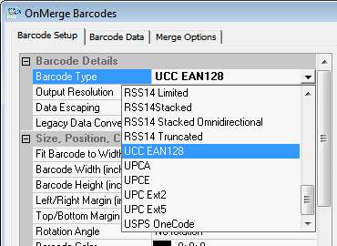 There are special considerations for using OnMerge Barcodes for barcodes like the one below beginning with a few digits in (parentheses) which are part of the GS1-128 family. GS1-128 barcodes go by many names, such as SSCC-18, SCC-14, GLN, and GTIN. NB Beware! You may see references to GTIN-8, GTIN-12, GTIN-13, or GTIN-14 (instead of just plain GTIN), but those something else entirely. They're other names for EAN-8, UPC-A, EAN-13, and 2 of 5 Interleaved (ITF-14), respectively. OnMerge Barcodes can also produce those. NB SCC-14 data can be placed in either UCC EAN128(GS-128) or 2 of 5 Interleaved (ITF-14) barcodes. If you need the style that begins with (01), use the instructions on this page. If you need the style with no (01) [and probably bars or a box around the barcode], use 2 of Interleaved and make sure to select the Generate Check Digit option. Don't use Code 128 for these -- use UCC EAN128 If you receive specifications from a trading partner which either a) call for GS1 barcodes, b) show a sample 1-dimensional barcode like the one above beginning with a few digits in parentheses, or c) call for a Code 128 barcode beginning with "FNC1" or "Function Code 1," DON'T USE REGULAR CODE 128 as your Barcode Type. Use UCC EAN128 instead. UCC EAN128 is a special sub-type of Code 128 barcodes which automatically includes the invisible FNC1 indicator in the barcode, and which has special processing/verification rules to deal with parentheses and generate checksums in certain cases. Entering Data The leading digits in parentheses such as (00) are called the Application Identfier. They identify the meaning and format of the digits that follow. The barcode data you enter or retrieve from a database must include the () characters around the Application Identfier, immediately followed by all the data digits. No blanks or punctuation. OnMerge will remove the parentheses from the barcode's internal representation, but needs the parentheses to verify the data's format. Certain Applications such as SSCC-18 (Application Identifier 00) may call for a checksum as the last digit. OnMerge Barcodes will compute the checksum for you automatically, BUT you must include a "dummy" digit such as zero where the checksum is supposed to appear. OnMerge Barcodes will silently change the dummy digit to the correct value. Adding spaces between the digits of human-readable text Some trading partners may specify spaces between certain digits in the human-readable text. Unfortunately, the rules for placing the blanks varys significantly, even for a given Application. Given this, OnMerge Barcodes shows the human-readable text as a solid block of text by default. For example, this SSCC-18 shows up as You can easily add blanks in specific places using the Text Filter & Format option on the Barcode Setup tab. Enter a ? for each data digit (including the parenthesis characters) and a space wherever you need to insert one. The Format for the example above would be