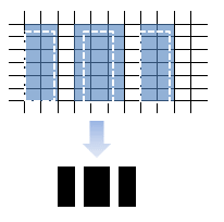 This diagram shows an enlarged view of the printer's grid, with 2-unit wide dark and light bars in blue laid out on it. Because the bars match the grid exactly in this example, the resulting bars shown in black are even. What happens if the barcode's resolution doesn't match the printer The position and size of the dots that make up the printer's grid can't be changed. Furthermore, each dot can only be fully colored (e.g. black) or blank (i.e. white). This forces a hard decision on the computer driving a printer if a barcode being printed doesn't line up with the printer's grid. For example, what if some bars in a barcode are supposed to be 1.75 dots wide? The answer is that there is no "good" choice that the computer can make, so it falls back on some rules of thumb.