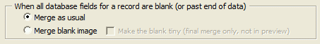 The File Name formulas that you create may contain some database field lookups, and the database fields for some records may be completely empty or blank. You may also see some phantom empty "records" beyond the end of the database on the last page of a series of labels. The blank fields will probably prevent the resulting file name from matching any graphics file, and OnMerge Images will fall back to the behavior that the Missing-image option specifies. The regular missing-image is fine for some applications, but some applications require one kind of action for truly "missing" files but need a blank in the case where the whole database record is empty/blank Setting the Empty-Record Behavior Click the Merge Options tab in an image's OnMerge Images dialog to access the empty-database action frame. Select one of the buttons to indicate what should happen only in the case where all the database fields in the file name formula are empty/blank for a given record. Merge as usual causes missing-image to go on as usual as described in the Handling Missing Images topic. Merge blank image will make OnMerge use a blank for a given record when ALL the database and address fields in the file name formula are blank or missing. This will occur even if the file name formula is a mix of database/address and other types of fields. The Make blank tiny option is available when Merge blank image is selected; it works just like the Make this image tiny option in Handling Missing Images. Again, the result of selecting Make blank tiny will show up in final merges only. Word's on-screen preview will not make preview images tiny because they'd be too small to select and edit.