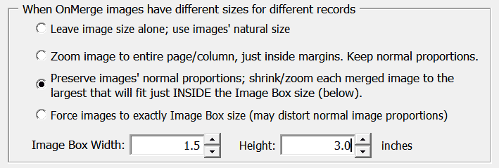 By default, OnMerge Images creates images inside a box that is 1" (2.5 cm) square. Resizing the OnMerge Image Different images that you merge in the same spot may have different sizes and orientations. When you actually do the merge, OnMerge will size the image to the largest possible size that your master template supports. There are two ways to tell OnMerge what that maximum size is:
